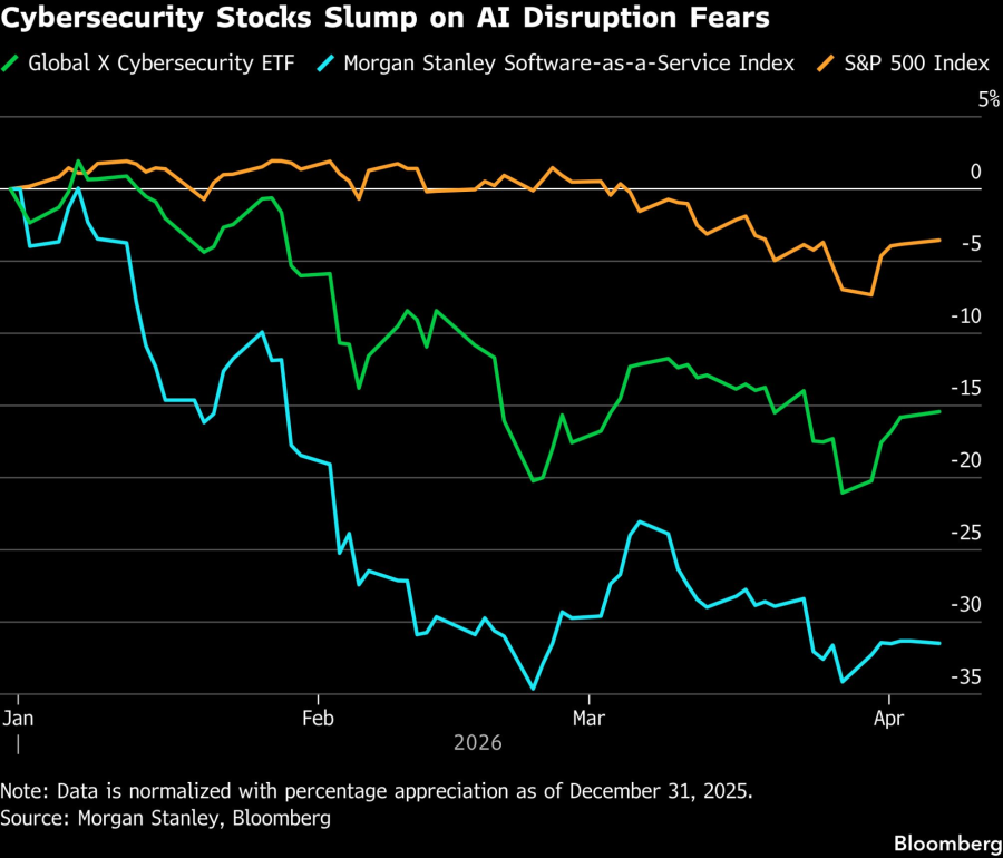 Proizvođači softvera za sajber bezbjednost takođe su osjetili taj pesimizam. Global X Cybersecurity ETF pao je 15 odsto u 2026. i nedavno je zatvoren na najnižoj cijeni od novembra 2023. Iako je to bolje od pada od 32 odsto u indeksu posvećenom softveru kao usluzi, i dalje je znatno lošije od pada od 3,4 odsto u S&P 500 Index i pada od 4,8 odsto u tehnološki orijentisanom Nasdaq 100 Index ove godine.