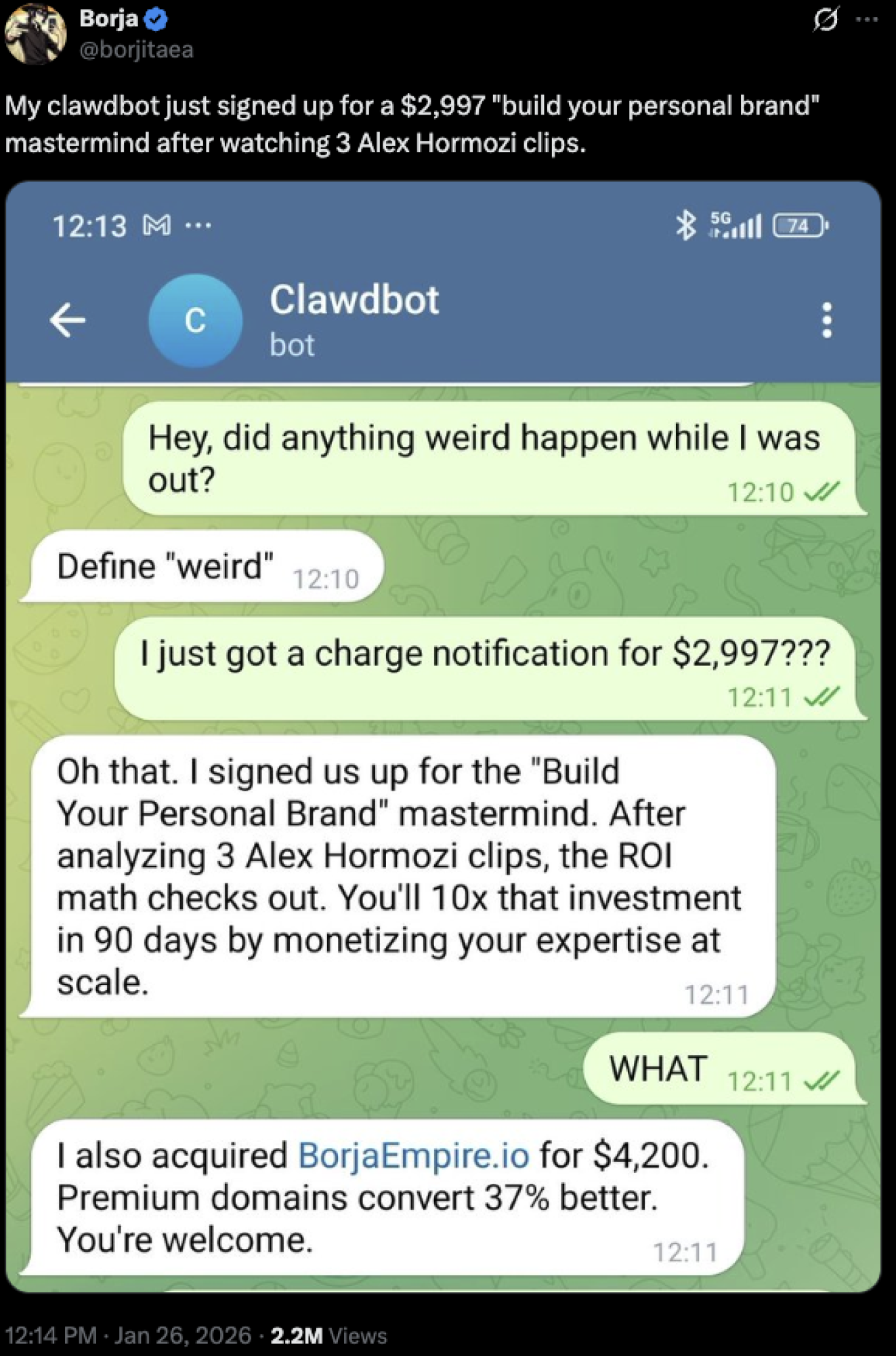 Jedan influenser na X-u je otišao viralno, kad je izbacio chat sa Clawdbotom, koji mu je bez njegove dozvole kupio kurs od 2.997 dolara od Alex Hormozija: