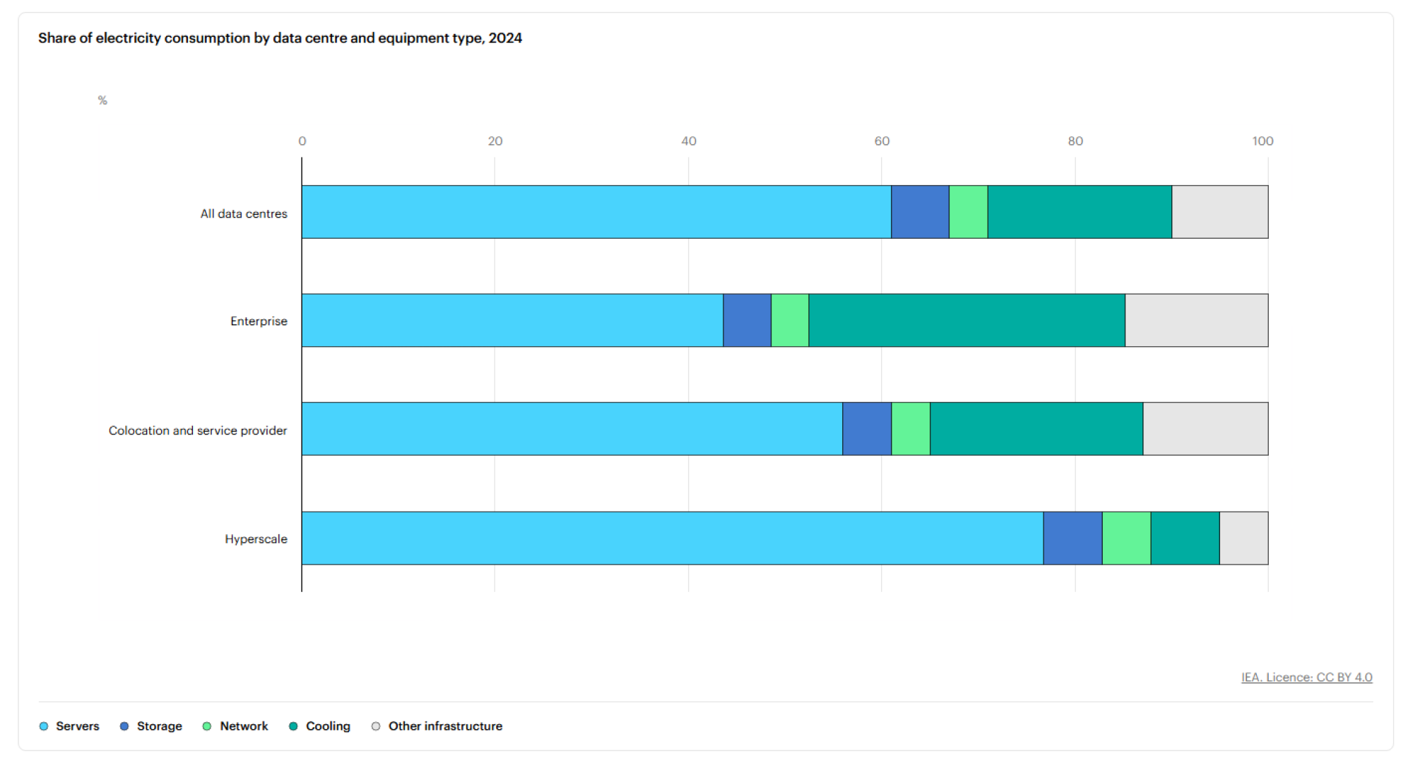 Udio potrošnje električne energije po tipu data centra i opreme (2024) | Izvor: Međunarodna agencija za energetiku (International Energy Agency)