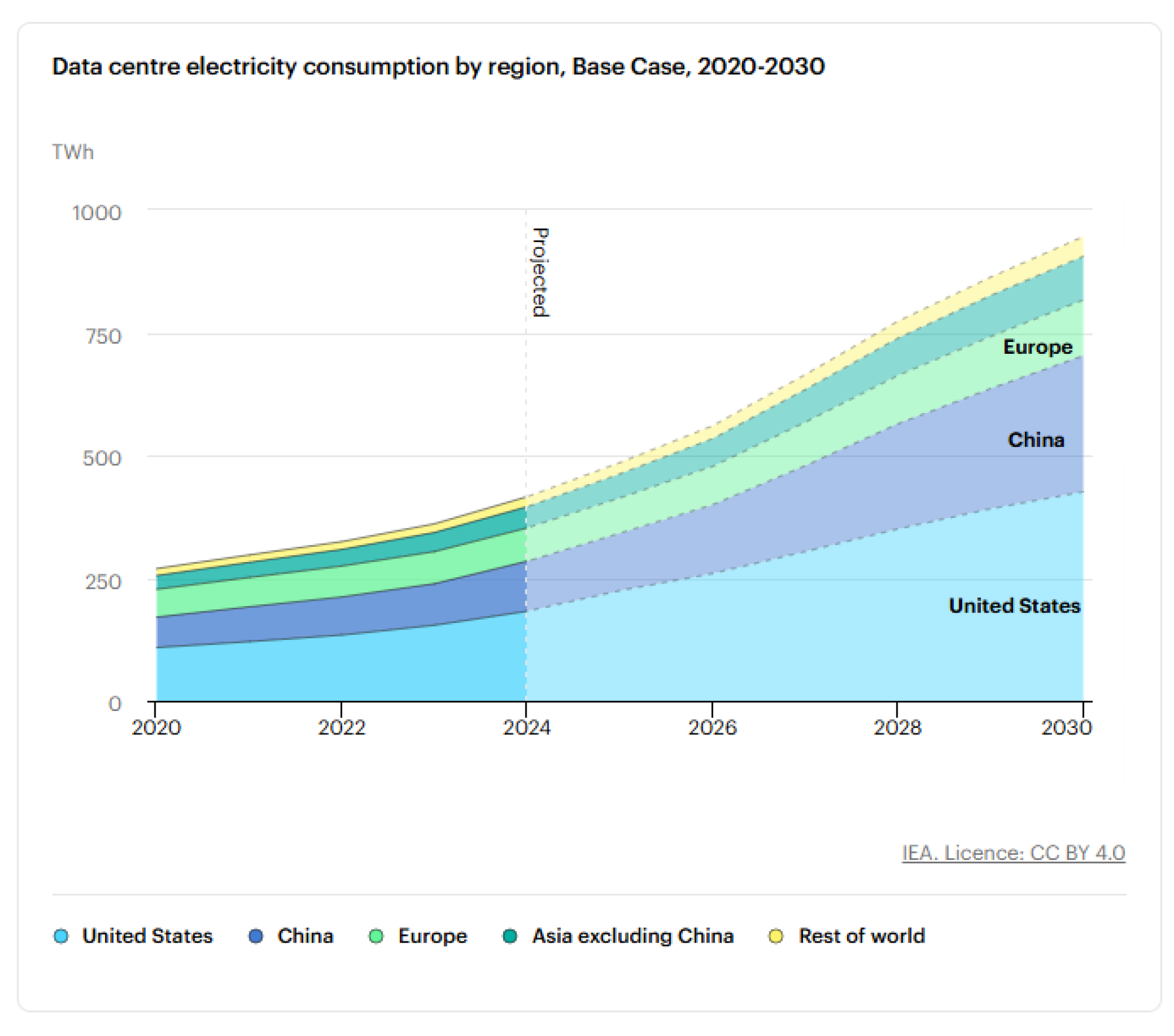 Potrošnja električne energije u data centrima po regijama (osnovni scenarij za period 2020-2030) | Izvor: Međunarodna agencija za energetiku (International Energy Agency)