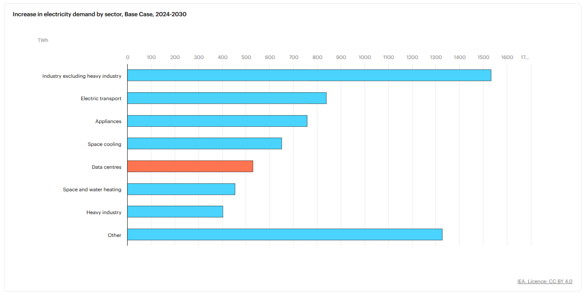 Rast potražnje za električnom energijom po sektorima (osnovni scenarij za period 2024-2030) | Izvor: Međunarodna agencija za energetiku (International Energy Agency)