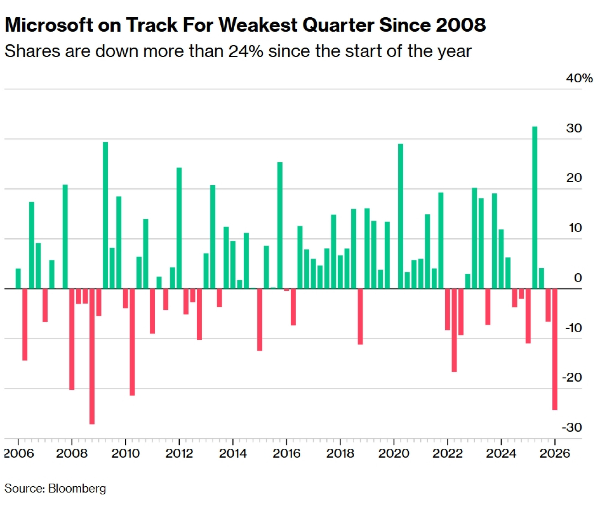 Microsoft Corp. nalazi se na sjecištu dvaju zabrinjavajućih trendova koji potresaju tehnološki sektor, zbog čega je dionica na putu prema svom najgorem kvartalnom rezultatu od globalne financijske krize prije dva desetljeća.