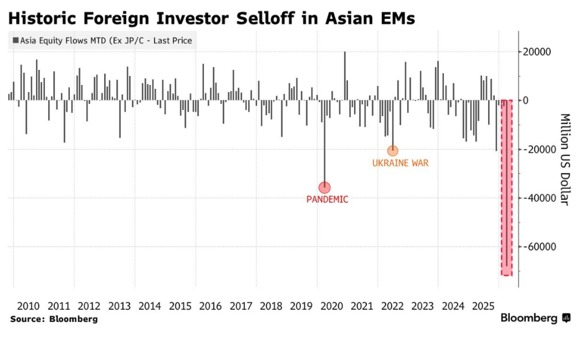 Strani investitori su prošlog mjeseca povukli rekordnih 68 milijardi dolara s azijskih tržišta u razvoju, ne računajući Kinu, što je gotovo dvostruko više od egzodusa izazvanog pandemijom u ožujku 2020. i više nego trostruko veći gubitak od onog u lipnju 2022. uzrokovanog ratom u Ukrajini.