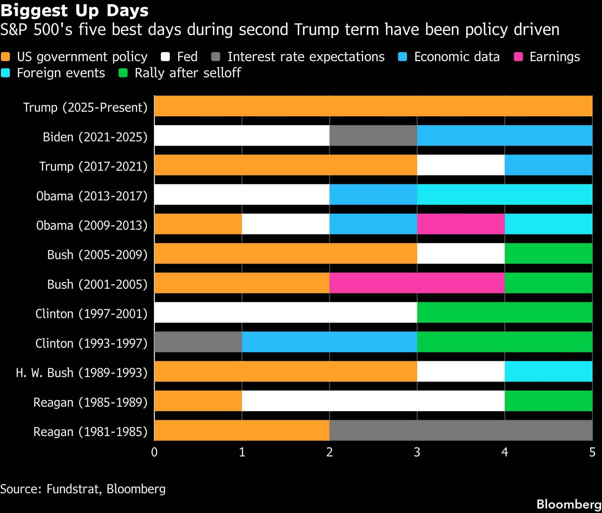 Od stupanja na dužnost prošlog januara, Trumpovi komentari novinarima, bilo u neformalnim susretima u Ovalnom kabinetu ili na zvaničnim konferencijama za medije, kao i njegove objave na društvenim mrežama, bili su glavni pokretač pet najboljih i pet najgorih dana indeksa S&P 500 Index, pokazuje analiza kompanije Fundstrat Research. Takav utjecaj nema presedana među modernim američkim liderima, nijedan predsjednik nije imao toliko utjecaja na najbolje i najgore dane tržišta u posljednjih dvanaest administracija, još od vremena Ronald Reagan 1981. godine.