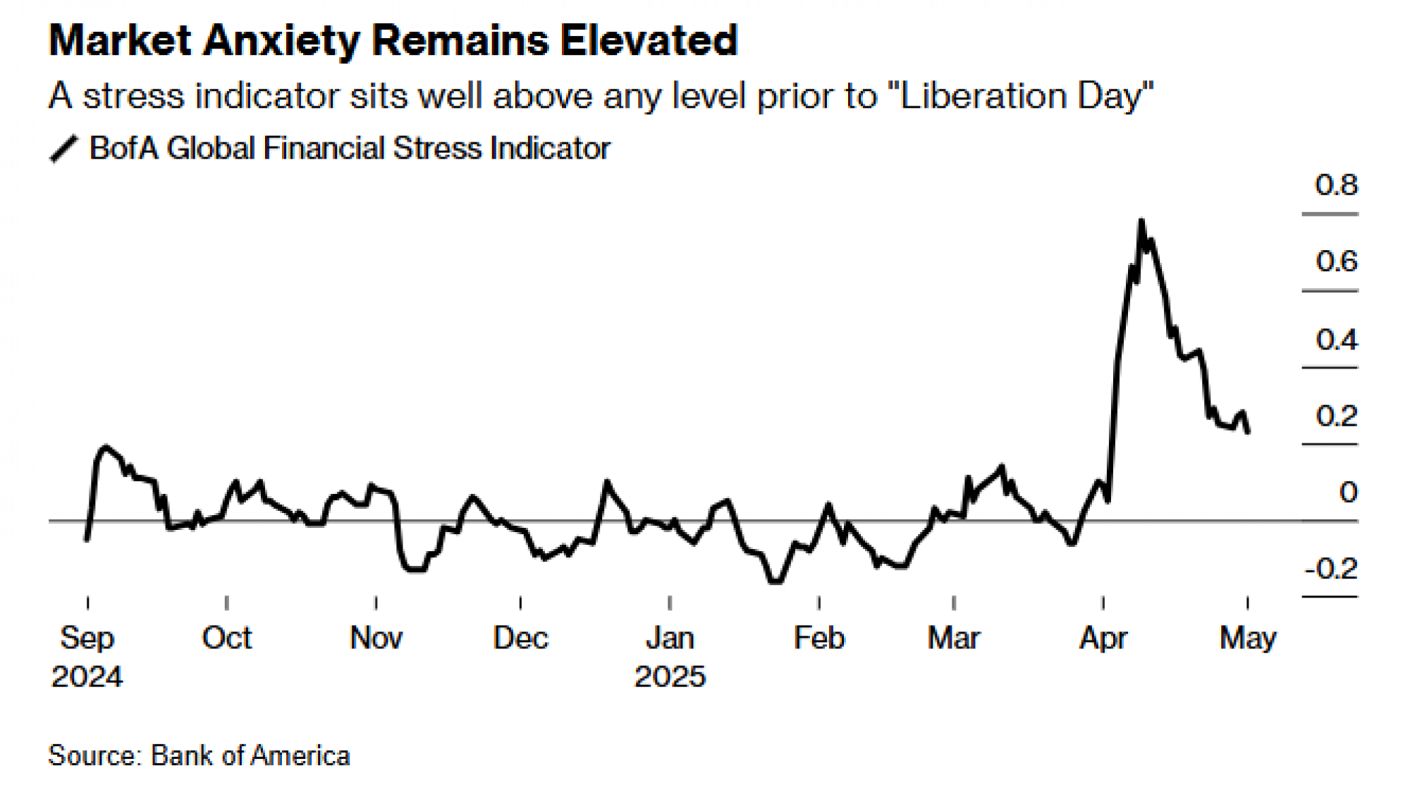 Ipak, u pozadini tržišta ostaje skepticizam koji dovodi u pitanje oporavak tržišta dionica vrijedan 5 bilijuna dolara u manje od dva tjedna. Pokazatelji tržišne anksioznosti su se smanjili, ali i dalje su povišeni. Čak i nakon tri tjedna pada, Bank of America-ov globalni indikator financijskog stresa i dalje je iznad razina viđenih u osam mjeseci prije Trumpovih prijetnji iz 2. travnja.