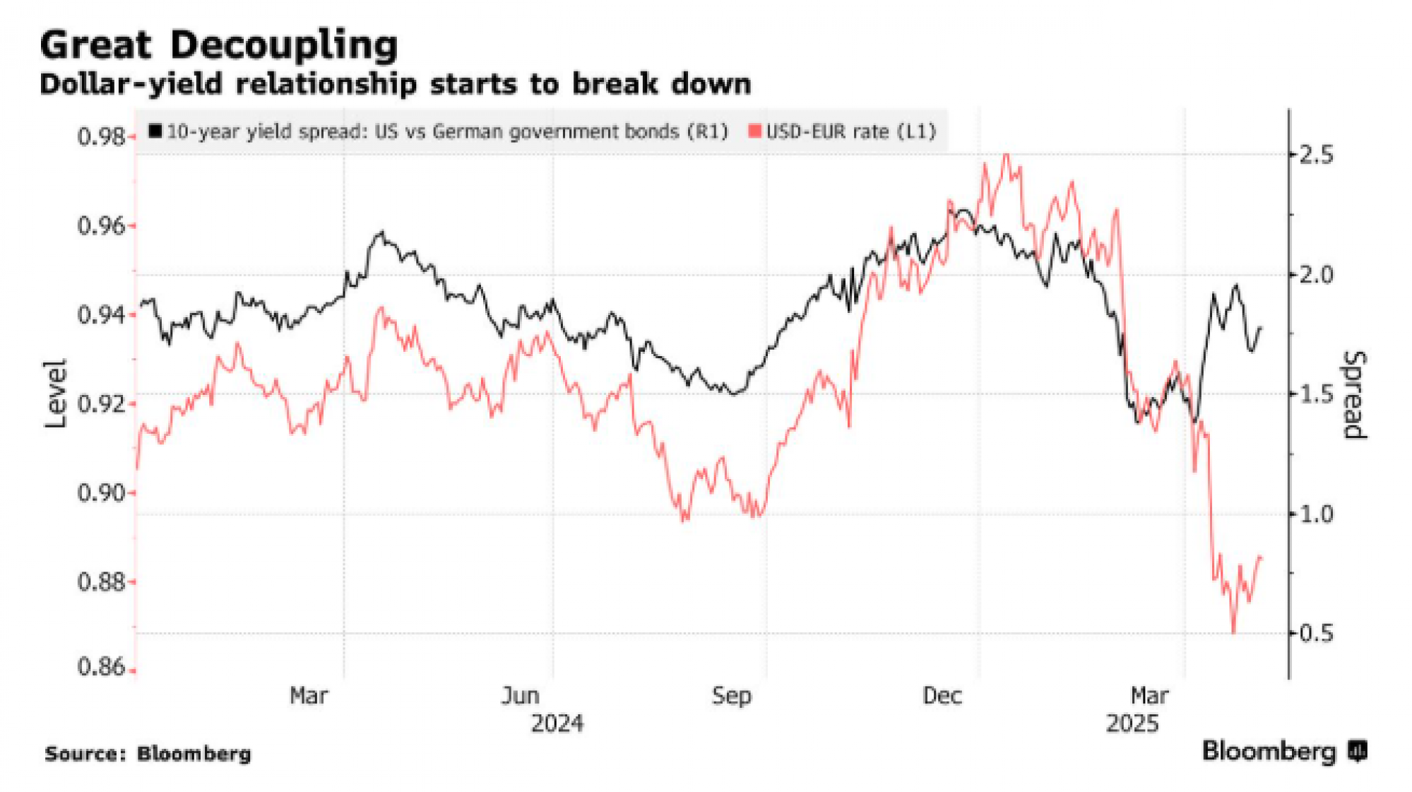 Allen također ističe neugodnu činjenicu da veza dolara s tržištem obveznica nastavlja slabiti. U teoriji, očekivalo bi se da američka valuta ojača u odnosu na euro kad prinosi na 10-godišnje američke obveznice rastu u odnosu na njemačke. To je djelomično zato što imovina s višim prinosom privlači kapital, jačajući valutu zemlje. No taj se odnos raspao još početkom travnja.
