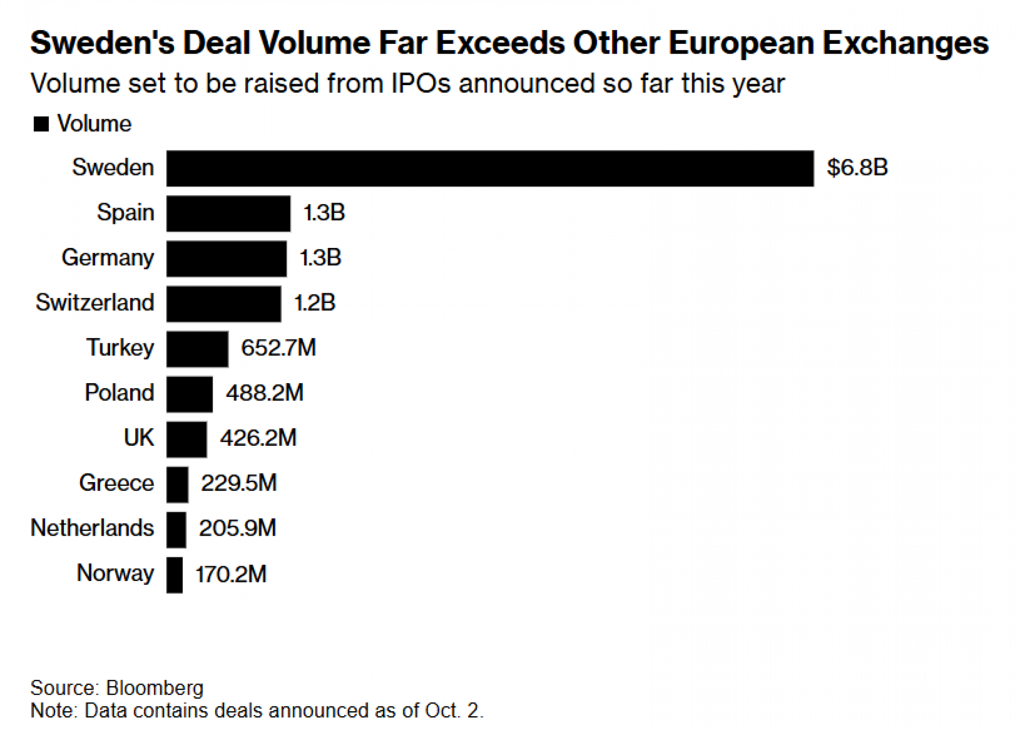 Unatoč nedavnom porastu IPO-a iz ostatka kontinenta, Švedska i dalje vodi s velikom razlikom. Ukupno je devet tvrtki ove godine izašlo na burzu, što je najviše od 2022., prema podacima koje je prikupio Bloomberg.