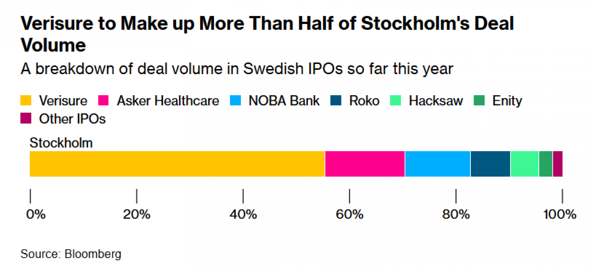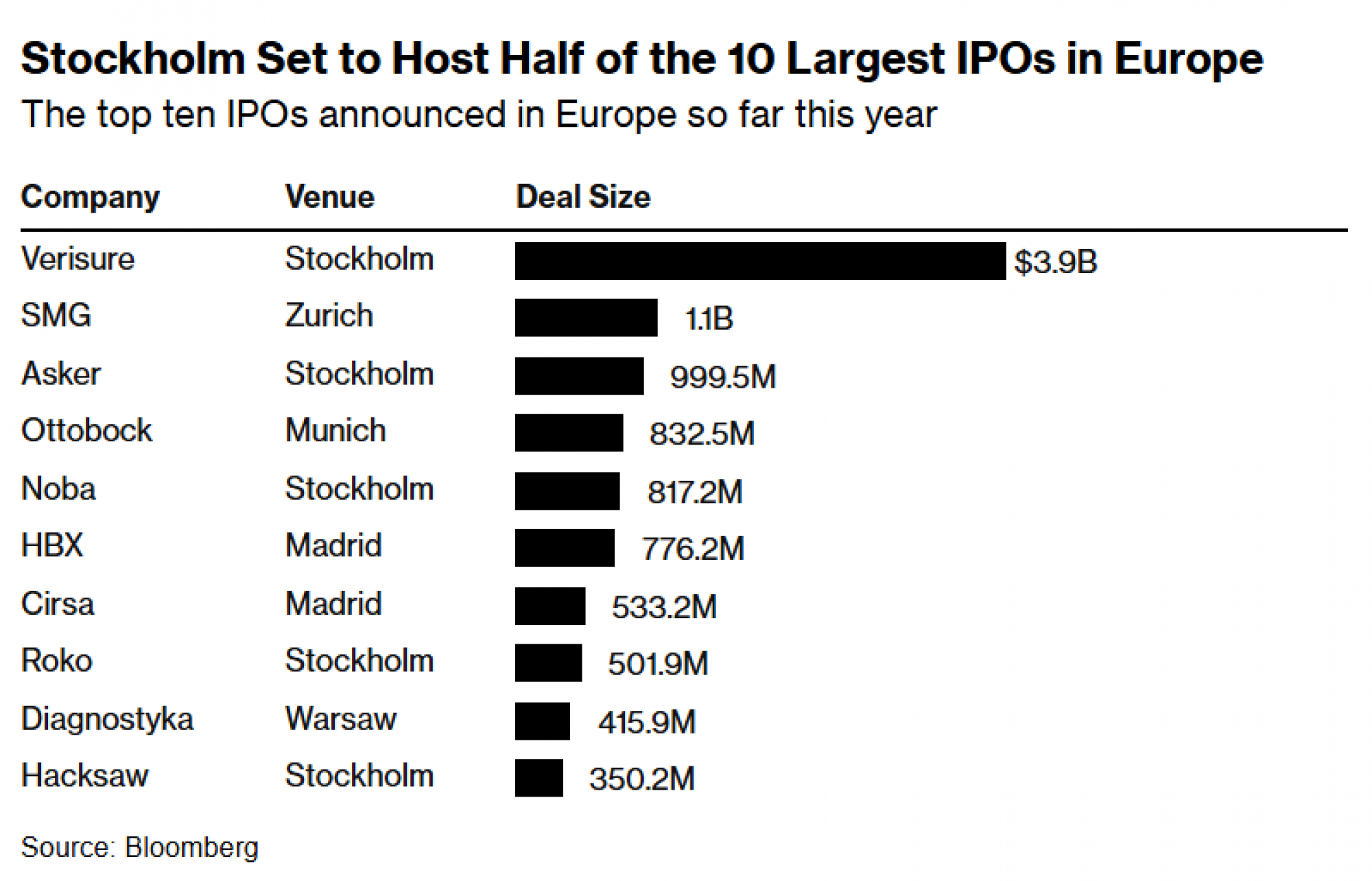 Švedska prijestolnica na putu je da ove godine prikupi 6,8 milijardi dolara kroz inicijalne javne ponude (IPO), više nego bilo koji drugi grad na kontinentu, te će idućeg tjedna ugostiti najveće europsko uvrštenje na burzu od 2022., kada na tržište dolazi tvrtka za sigurnosne usluge Verisure Plc. Na globalnoj razini, Stockholm je peta najpopularnija destinacija za izlazak na burzu, nakon Sjedinjenih Država, Kine, Hong Konga i Indije - što je iznenađujući uspjeh za tržište koje je tek trećina veličine londonskog.