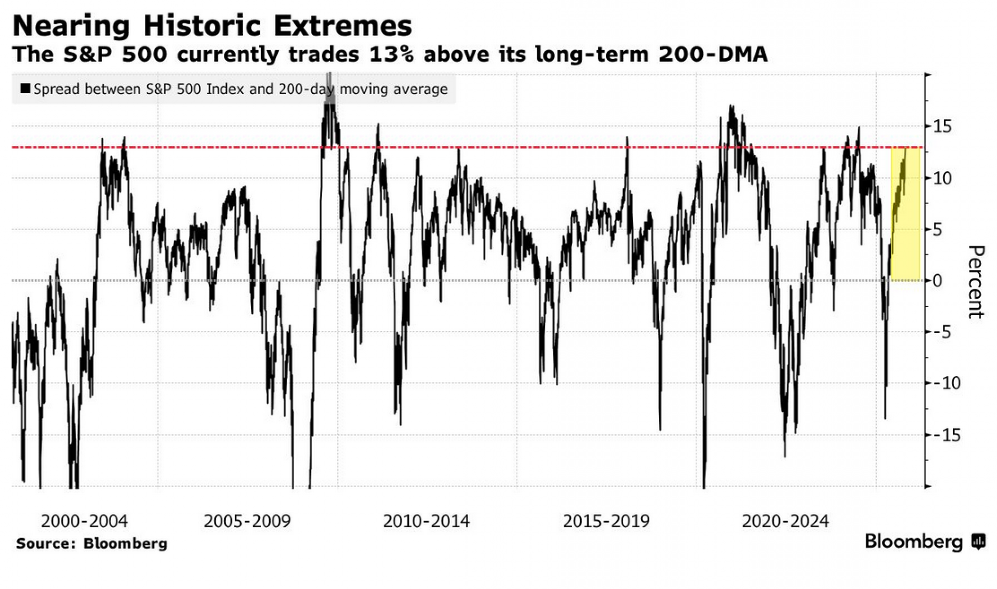 Raste zabrinutost u vezi s vrednovanjem velikih tehnoloških kompanija u trenutku kada se još jedan ključni tehnički pokazatelj američkog tržišta akcija, 200-dnevni pokretni prosjek, čini prenapregnutim, približavajući se historijskim ekstremima. Trenutno se trguje 13 posto iznad svoje dugoročne linije podrške od 6.097 poena. Takav raspon je historijski ukazivao na skoru rasprodaju, što se desilo 2011, 2018. i 2021. godine, pokazuju podaci Bloomberga.