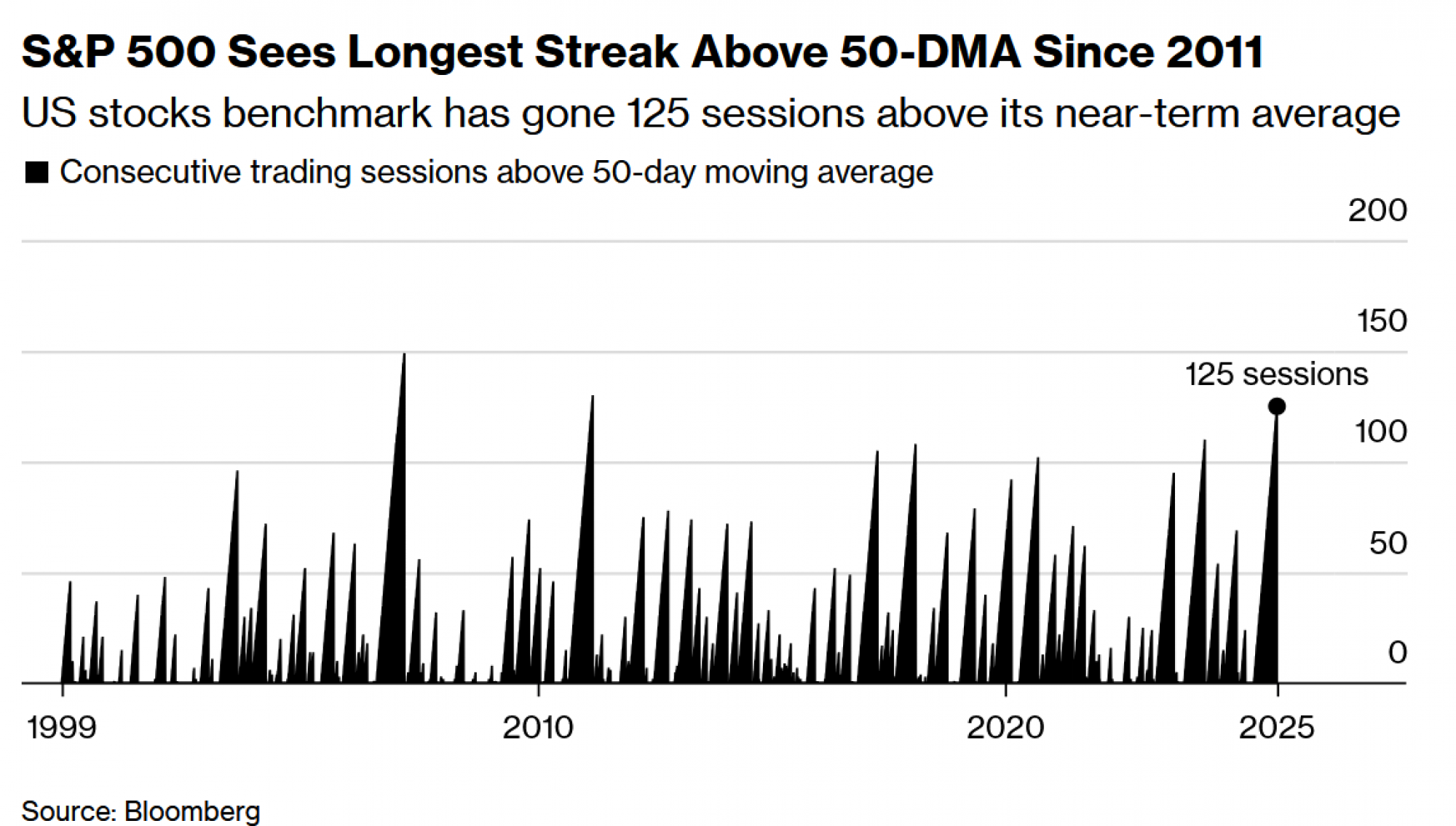 Indeks S&P 500 proveo je 125 trgovinskih sesija iznad svog 50-dnevnog pokretnog prosjeka, što je njegov najduži niz od 2011. godine, pokazuju podaci koje je prikupio Bloomberg. Referentni indeks zabilježio je samo tri duža niza u posljednjih 30 godina.