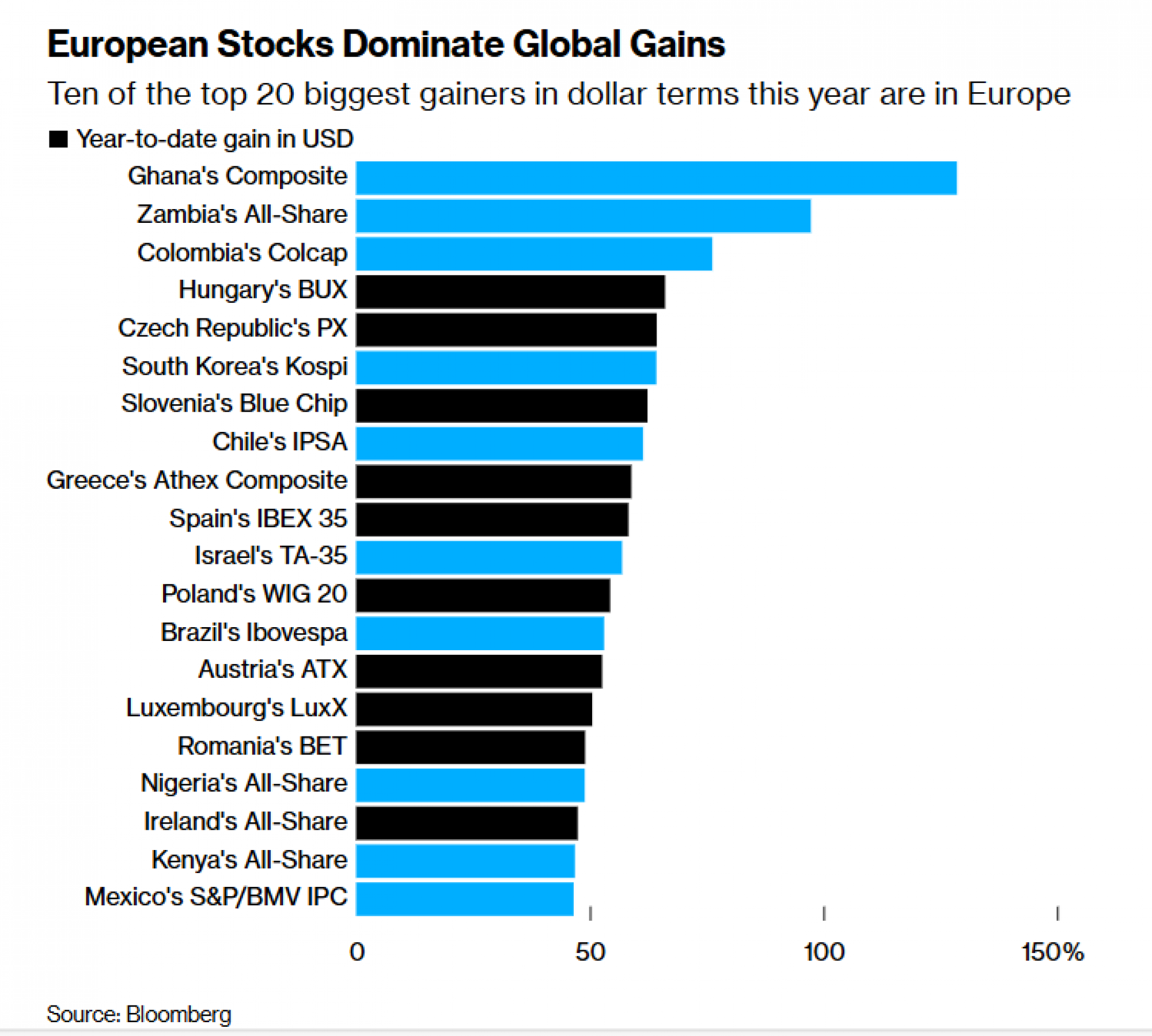 U redovima 20 najuspješnijih svjetskih berzi ove godine, svaki drugi indeks je evropski. To je dostignuće koje je region uspio da ostvari samo tri puta ranije i predstavlja svjedočanstvo obnovljenog povjerenja investitora u Evropu, gdje su se izgledi za rast konačno poboljšali. Takođe je predstavljalo iznenađenje, jer je većina stratega predviđala da će godina donijeti skromne dobitke, dok se očekivalo da će američka ekonomija podstaći bolju izvedbu na Wall Streetu.