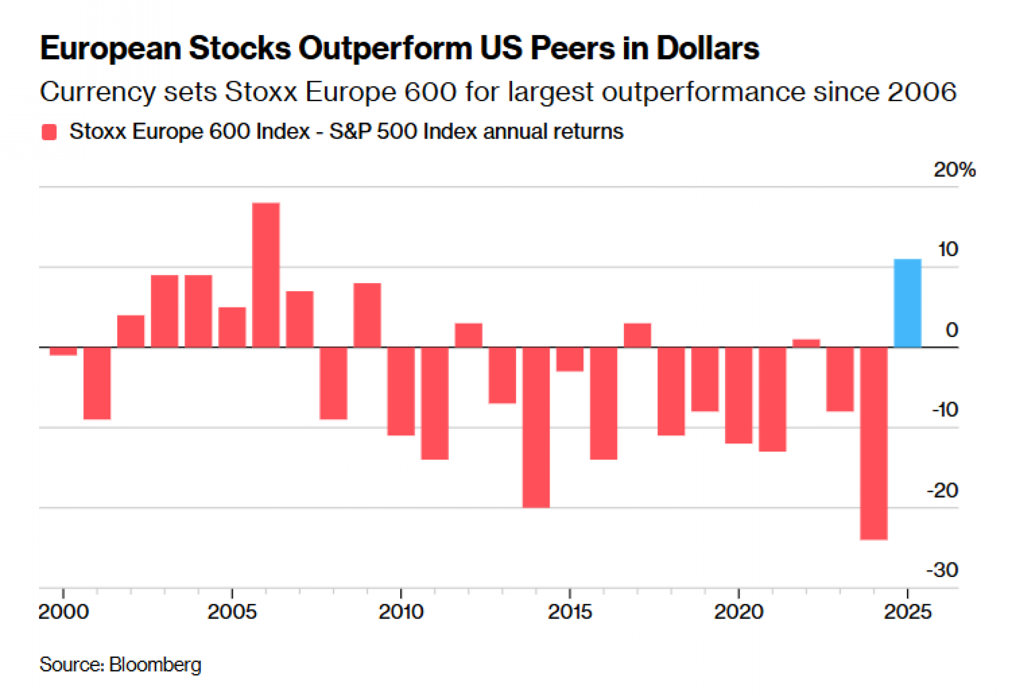 U godini potresenoj trgovinskim ratom predsjednika Donald Trumpa, evropske zemlje koje najviše novca zarađuju kod kuće, poput Italije i Španije, pokazale su se kao favoriti investitora. Relativno manja izloženost regiona trgovini vještačkom inteligencijom takođe je bila veliki plus u trenutku kada rastu zabrinutosti zbog još jednog američkog tehnološkog balona.
