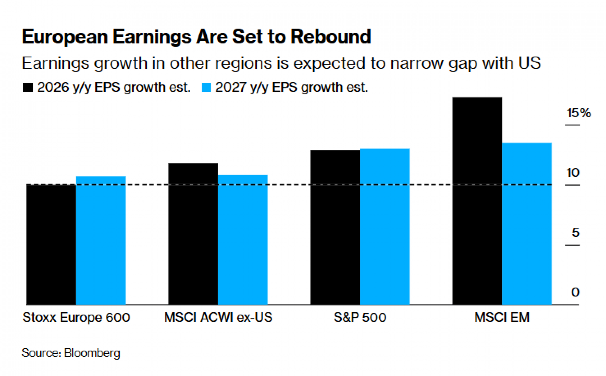 Analitičari očekuju da rast evropskih zarada konačno može da zatvori jaz sa SAD nakon zaostajanja još od 2023. Kompanije iz indeksa Stoxx 600 očekuju skok profita od 11 odsto sljedeće godine, dok se za zarade S&P 500 predviđa rast od 13 odsto u 2026, prema podacima koje je prikupio Bloomberg Intelligence.