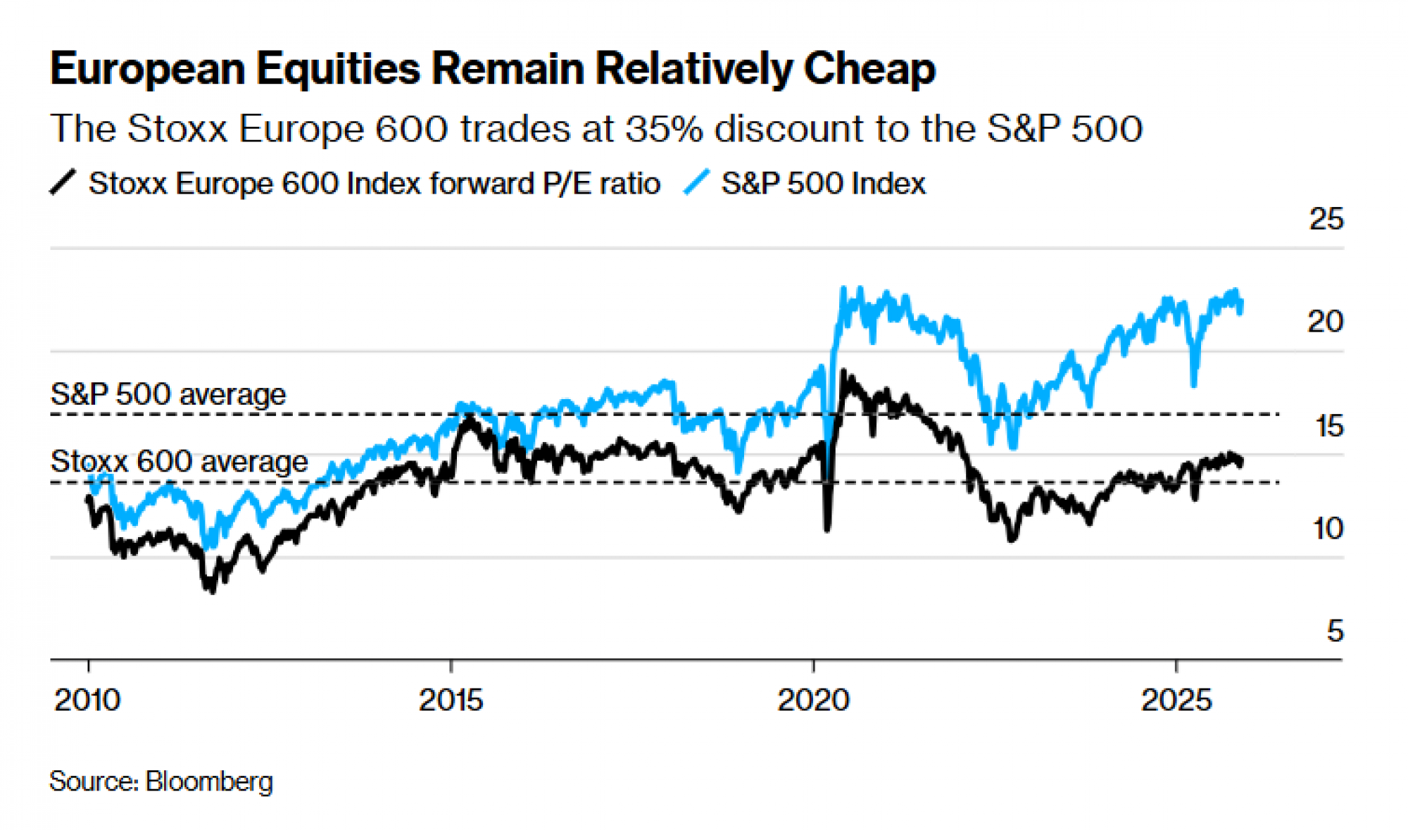 Dobra vijest za evropske akcije jeste da i dalje ostaju relativno jeftine čak i nakon ovogodišnjeg rasta. Indeks Stoxx 600 trguje se uz popust od 35 odsto u odnosu na S&P 500 na osnovu odnosa cijene i očekivane zarade. To znači da bi čak i mali rast zarada nakon gotovo nultog rasta u 2025. mogao biti dovoljan da tržište pogura ka novim vrhuncima.