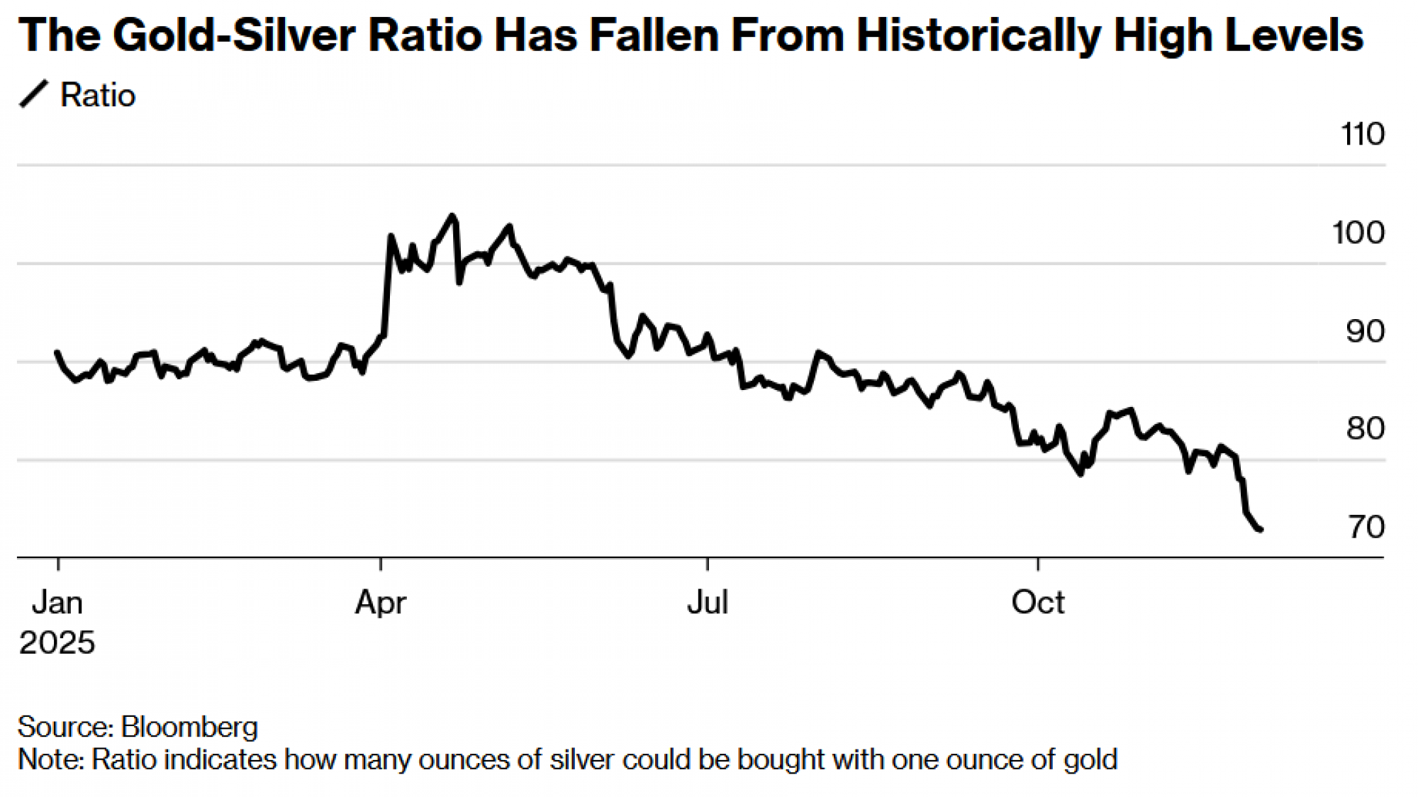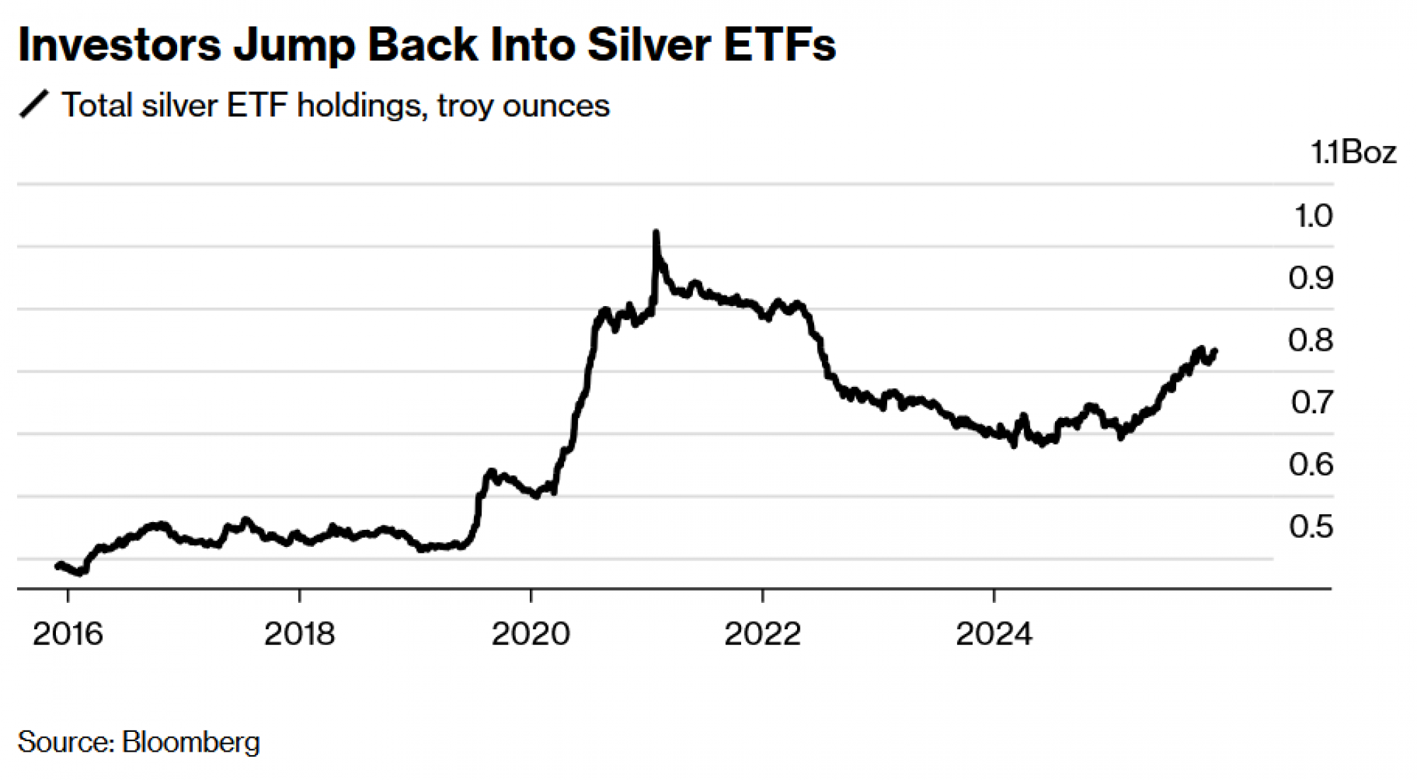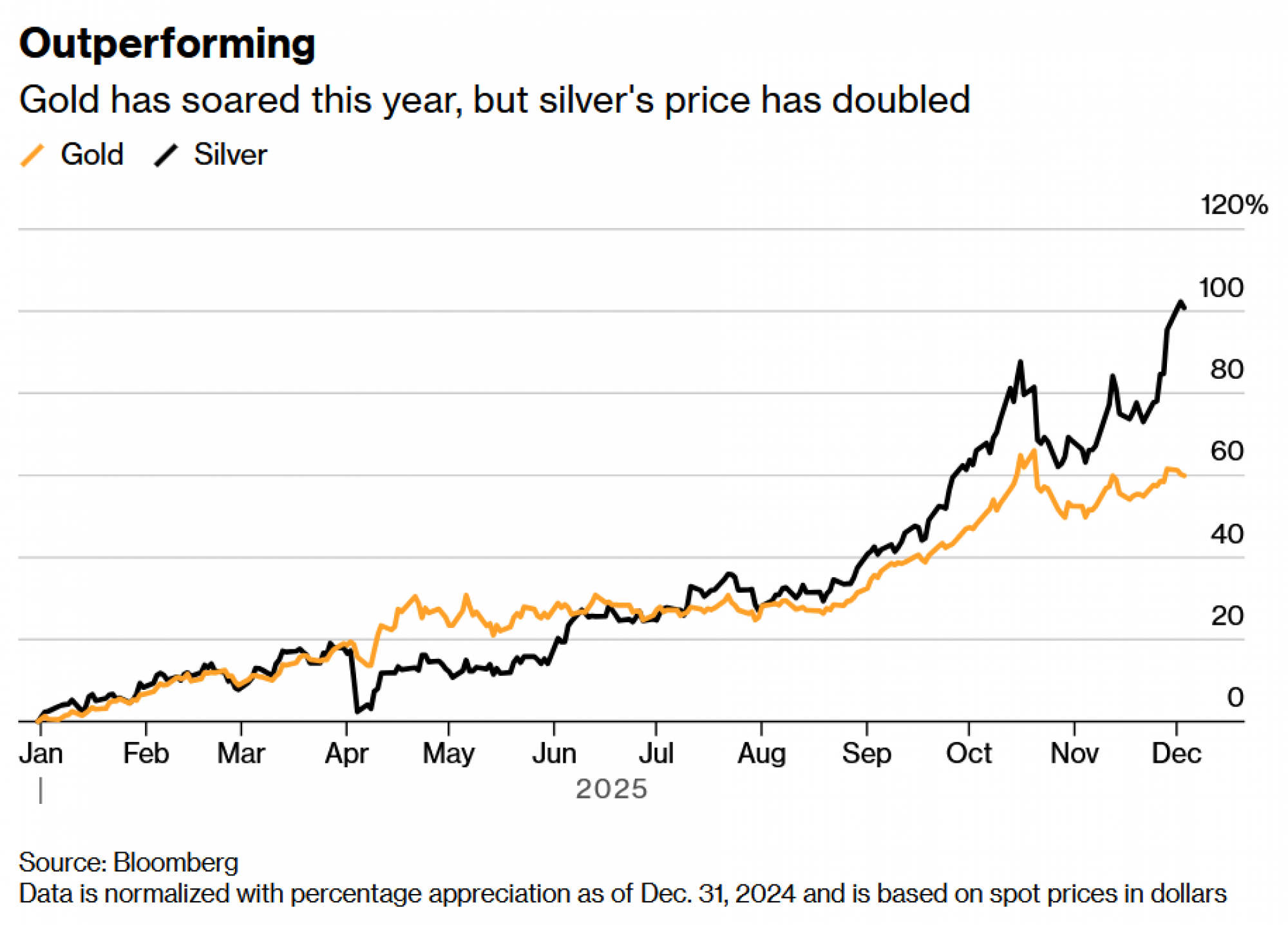 Srebro se često kreće u tandemu sa zlatom, ali s burnijim promjenama cijena. Nakon što je zlato naglo skočilo u prvim mjesecima 2025., neki su investitori istaknuli rastegnuti omjer cijena između dva metala veći od 100 naprema 1. Prividna jeftinoća srebra u odnosu na zlato bila je dovoljna da potakne neke investitore da ulože u njega.