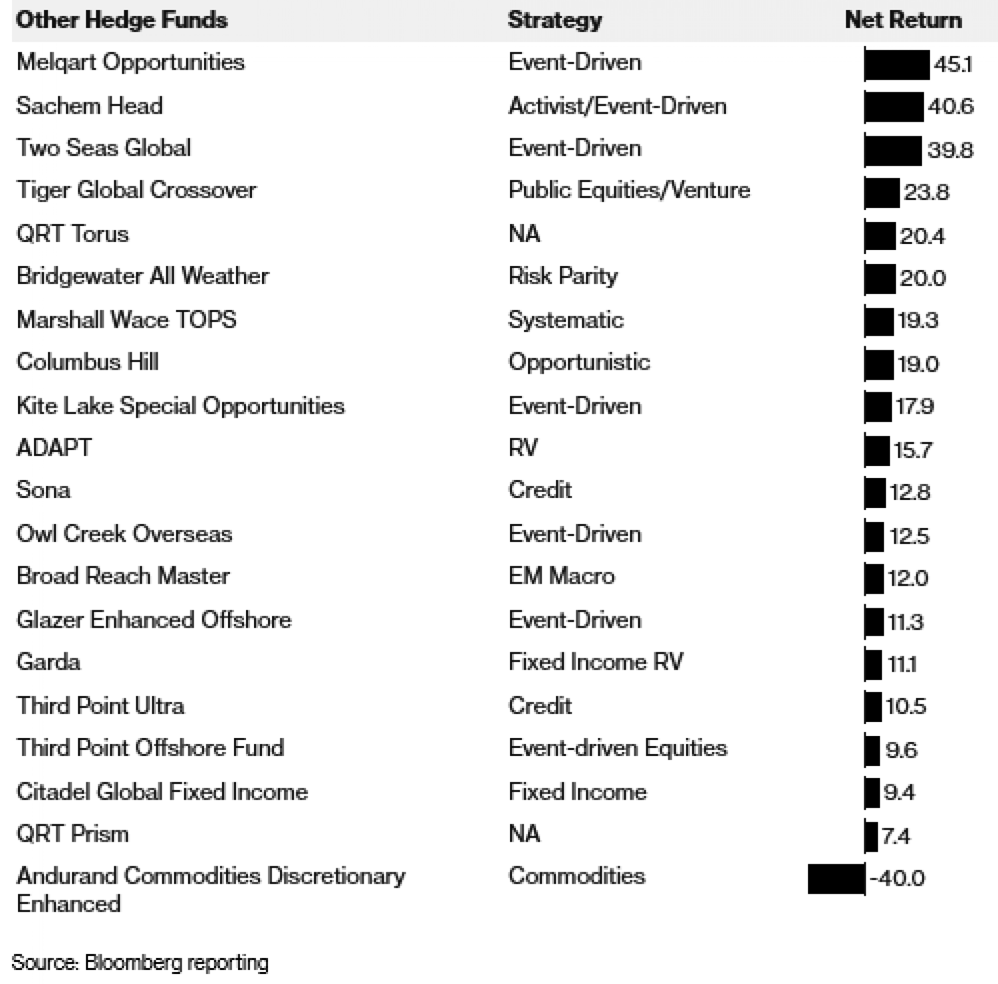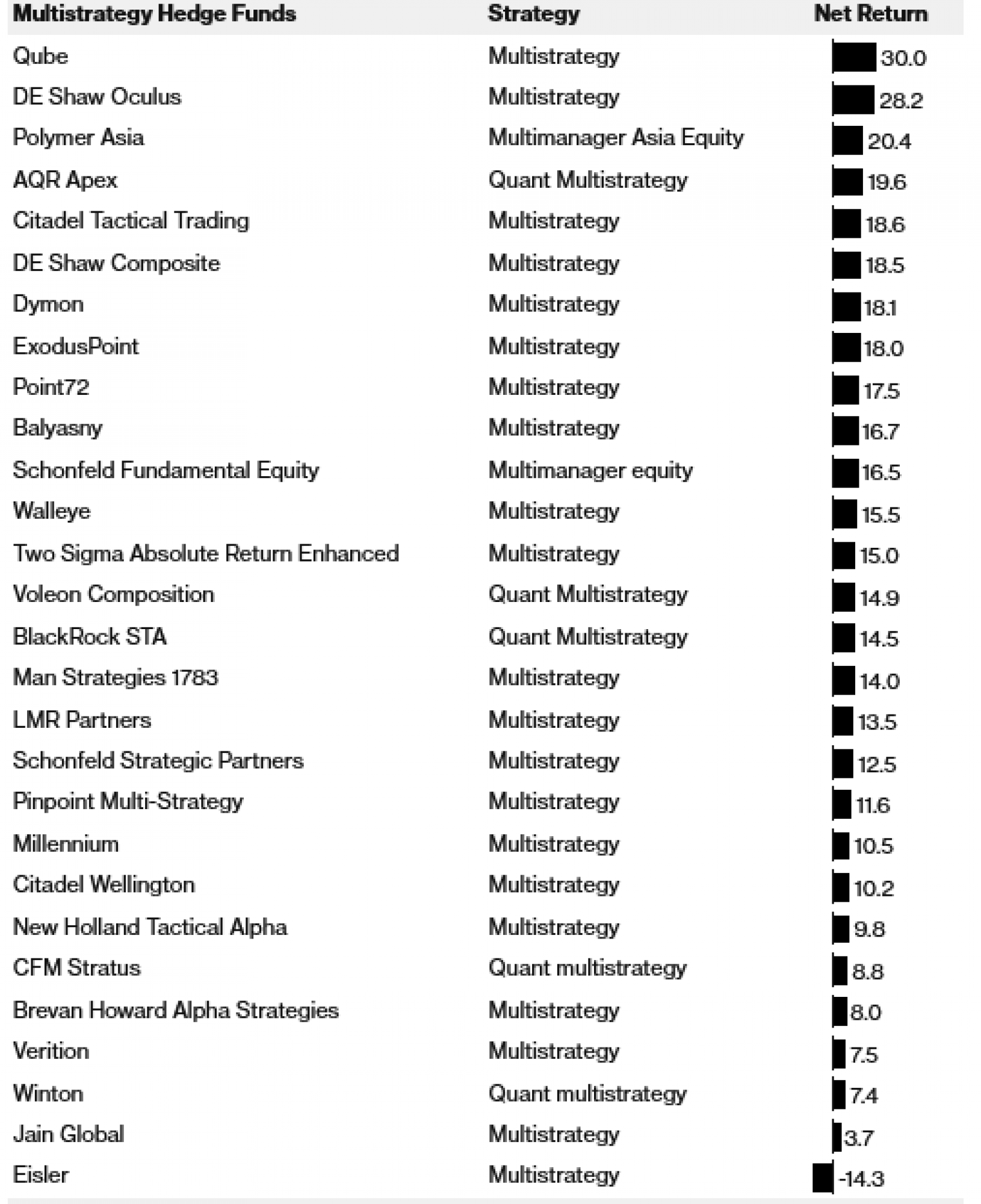 Fondovi kojima upravljaju industrijski divovi DE Shaw & Co., Millennium Management, Citadel, Point72 Asset Management i Qube Research & Technologies ostvarili su dvoznamenkaste prinose. Bridgewater Associates, investicijska tvrtka stara pola stoljeća, ostvarila je najveći ikad ostvareni dobitak od 34 posto u svom vodećem fondu Pure Alpha II.