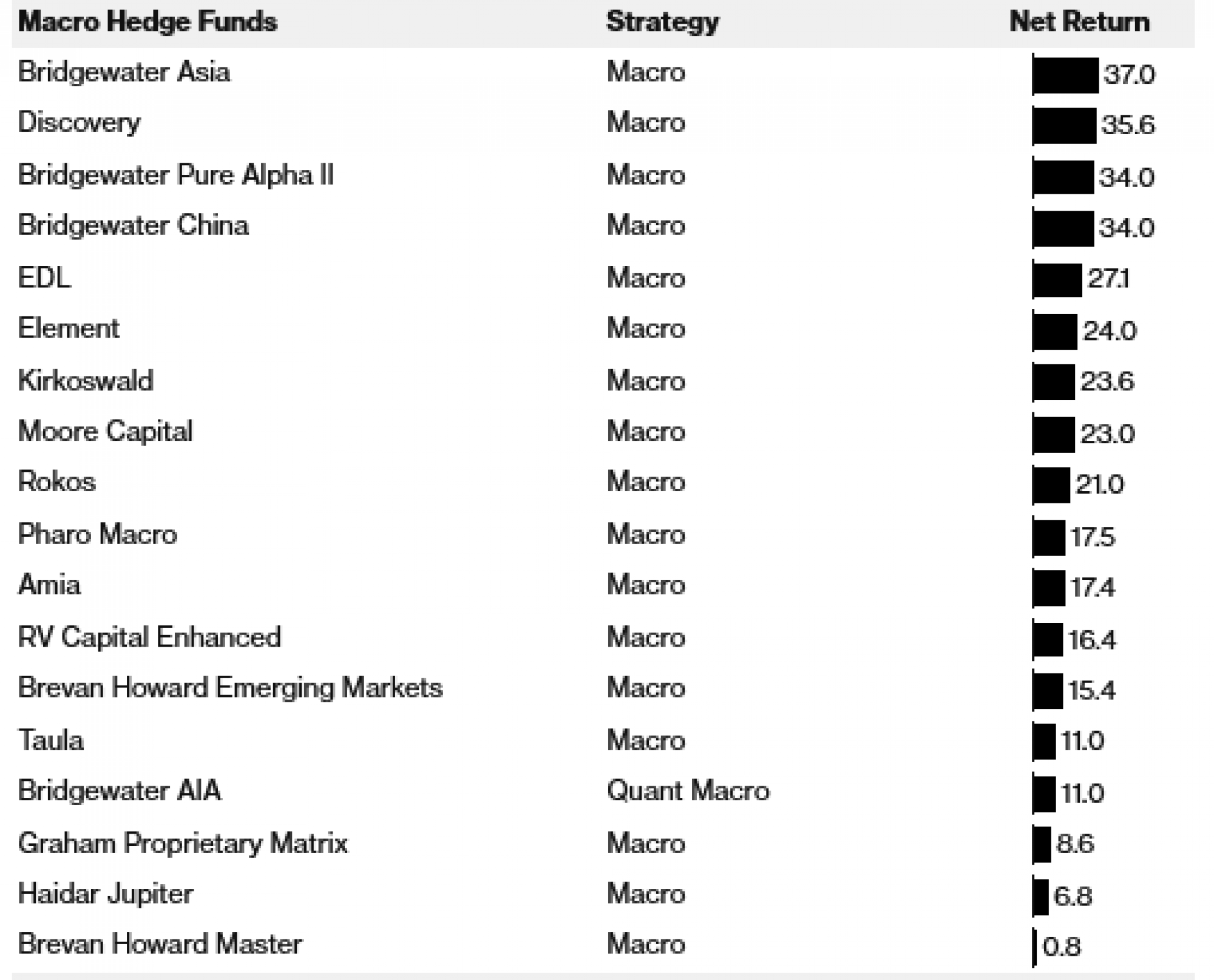 Drugi veliki makro traderi koji još uvijek upravljaju novcem klijenata, poput istoimene tvrtke Chrisa Rokosa i Discovery Capital Management Roba Citronea, također su zabilježili dvoznamenkaste dobitke. EDL Capital Edouarda de Langladea, koji je prethodno bio u tvrtki Moore Capital, ostvario je svoj najbolji rezultat od pokretanja 2015. godine s povratom od 27 posto.