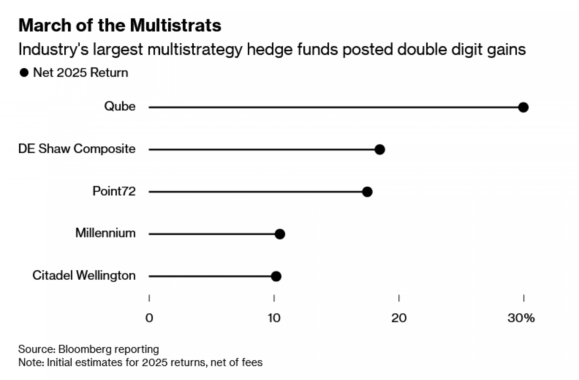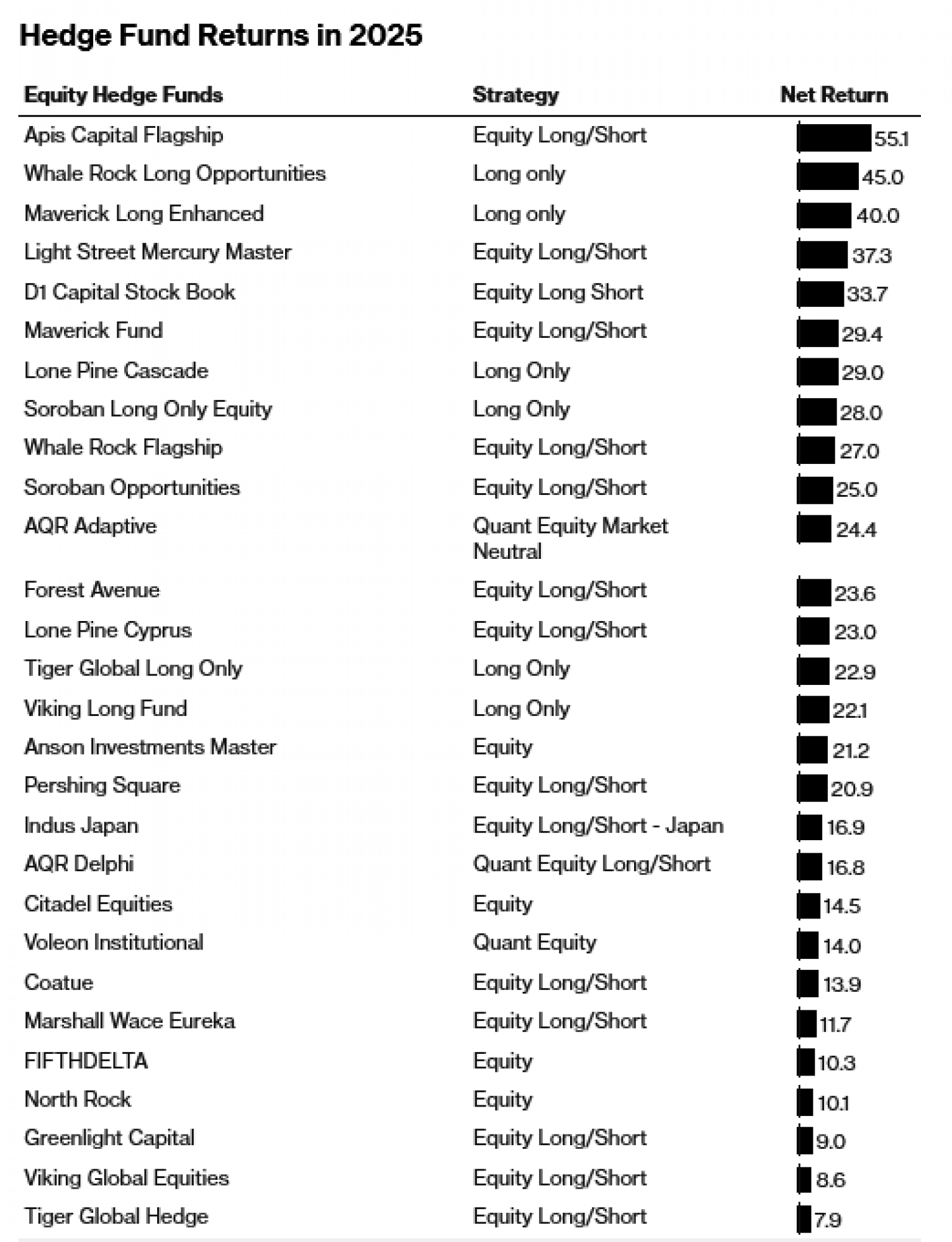 Manji fondovi usmjereni na određenu strategiju mogu ostvariti bolje rezultate u bilo kojoj godini s obzirom na njihovu sposobnost brzog ulaska i izlaska iz pozicija, ostvarujući znatne profite čak i dok se šira industrija bori. No čak su i najveće tvrtke s milijardama uloženim u mnoštvo strategija, što je taktika osmišljena kako bi se ostvario stalan dobitak kroz diverzifikaciju, uglavnom uspjele ponovno ostvariti dvoznamenkaste prinose u 2025. godini.