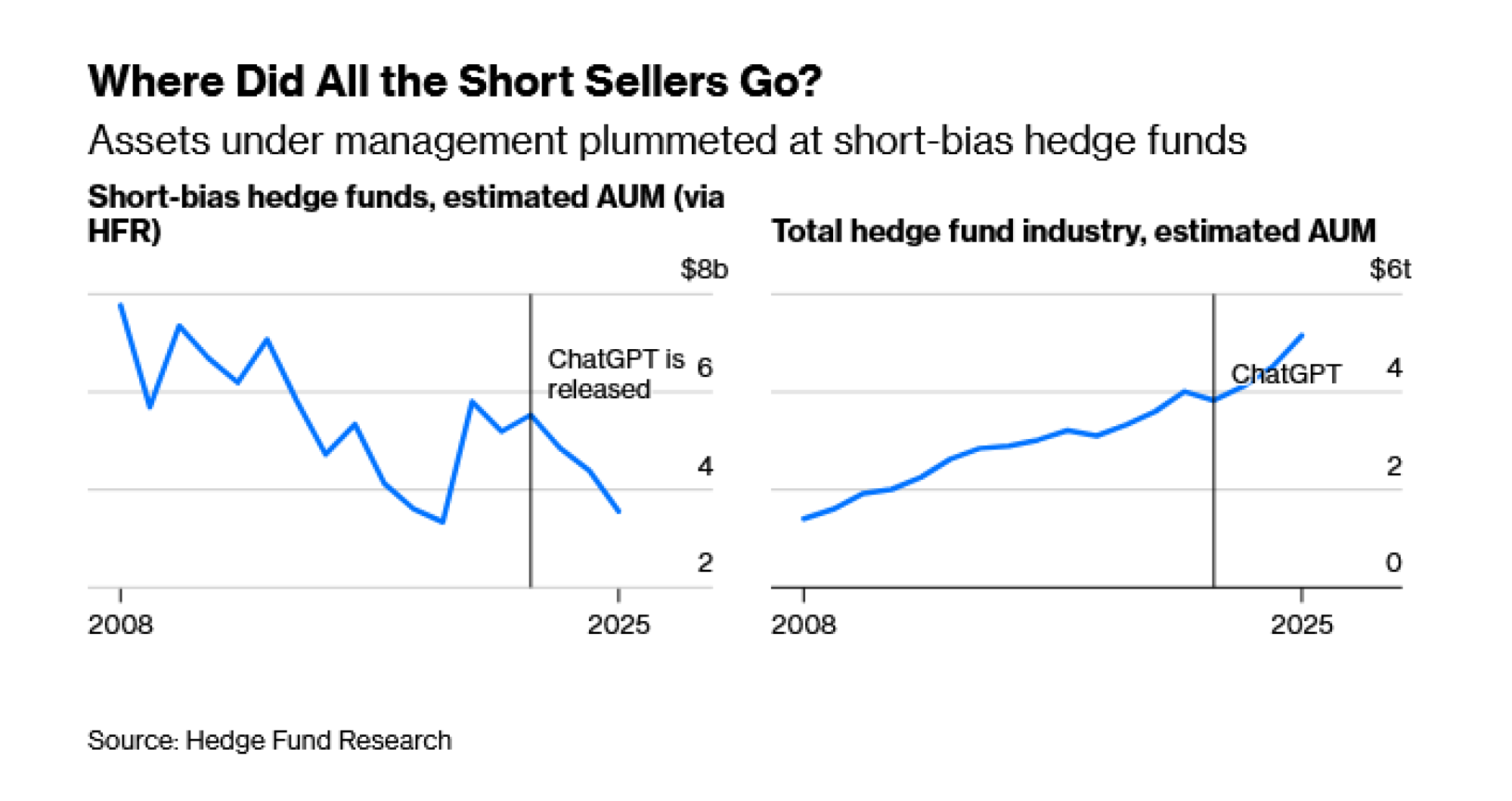 Kao što pokazuju podaci tvrtke Hedge Fund Research, imovina pod upravljanjem hedge fondova usmjerenih na kratke pozicije pala je za 31 posto na 3,6 milijardi dolara u pet godina do 2025. godine, čak i dok je šira industrija hedge fondova nastavila rasti. Broj fondova usmjerenih na kratke pozicije koje prati HFR pao je na 10 u usporedbi s 14 u 2020. godini i 48 u 2010. godini. Legendarni short seller Jim Chanos zatvorio je svoj hedge fond, a Muddy Waters Capital LLC Carsona Blocka u tom je razdoblju čak pokrenuo svoj prvi fond samo za duge pozicije.
