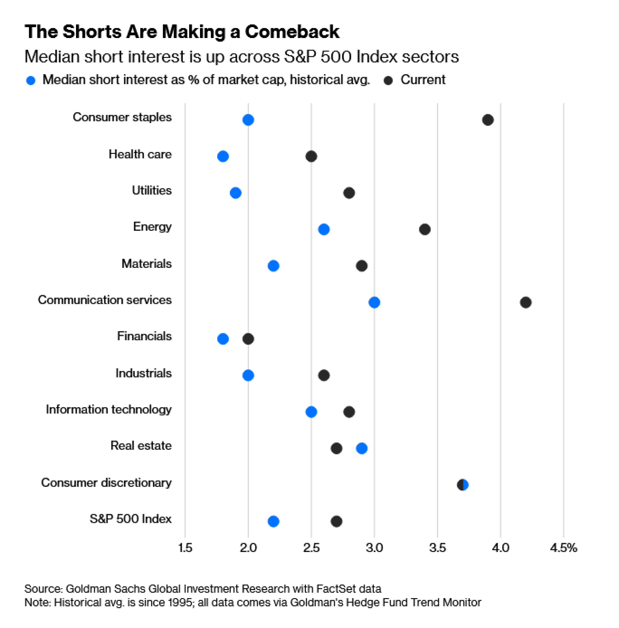 Loeb je u pravu. Udio kratkih pozicija u dionicama indeksa S&P 500 naglo se povećao u posljednjih nekoliko tromjesečja, dosegnuvši najvišu razinu u otprilike deset godina, nedavno su istaknuli iz tvrtke Goldman Sachs Group Inc. Udio kratkih pozicija znatno je iznad normale u svakom sektoru indeksa, a posebno je visok u sektorima robe široke potrošnje i zdravstvene skrbi (prema njihovim standardima).