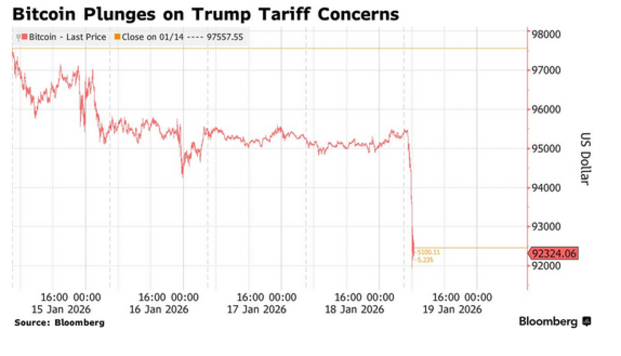 Kriptovalute su naglo pale jer je rizična imovina pala, a potražnja za utočištem ojačala nakon što je američki predsjednik Donald Trump predložio nove namete za osam evropskih zemalja.