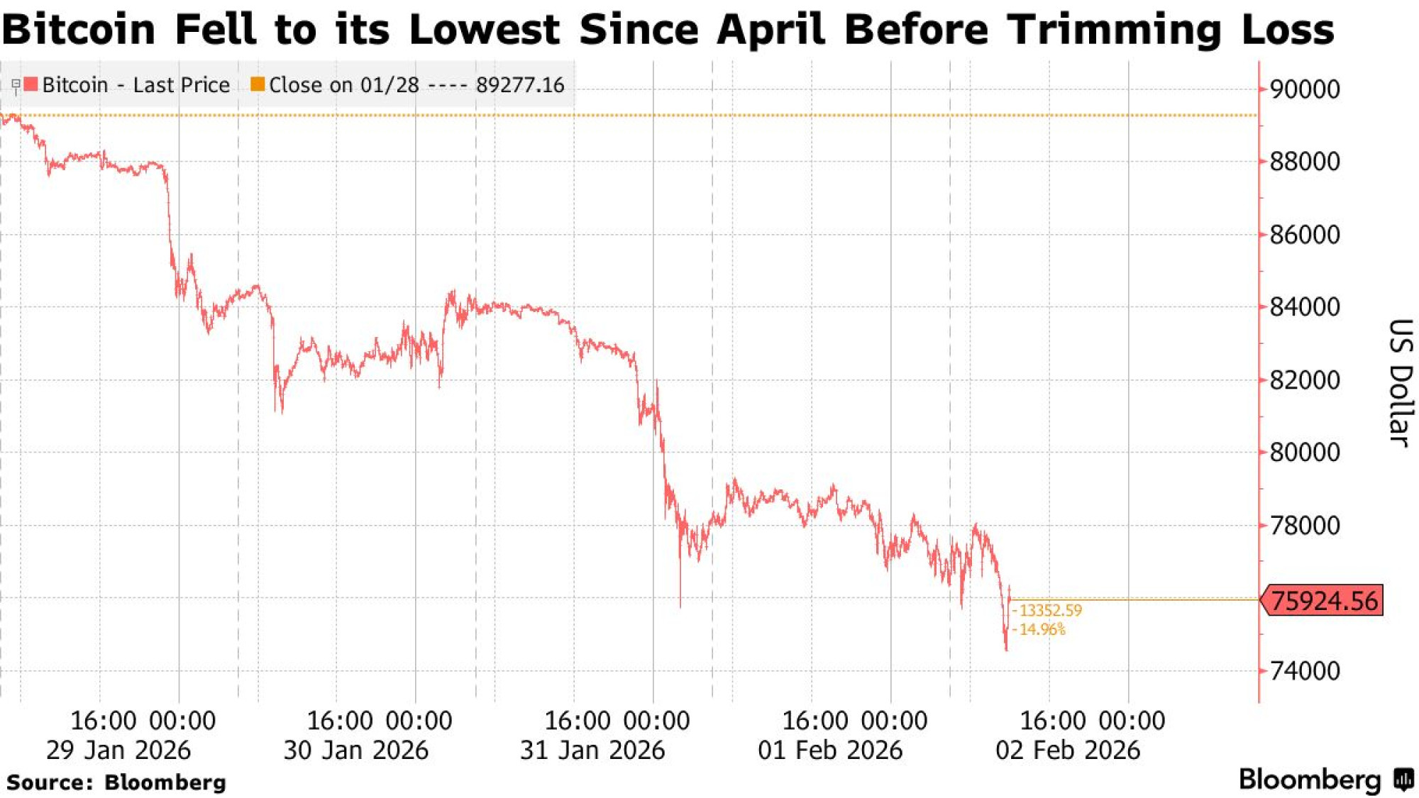 Najveća kriptovaluta pala je za čak 2,5 posto na 74.541 dolara, što je tek nešto manje od najniže razine otkako je Donald Trump ponovno preuzeo Bijelu kuću prije nešto više od godinu dana. Ta je razina iznosila 74.425 dolara i zabilježena je 7. travnja. Ostala je ispod 76.000 dolara u 6:30 ujutro po londonskom vremenu.