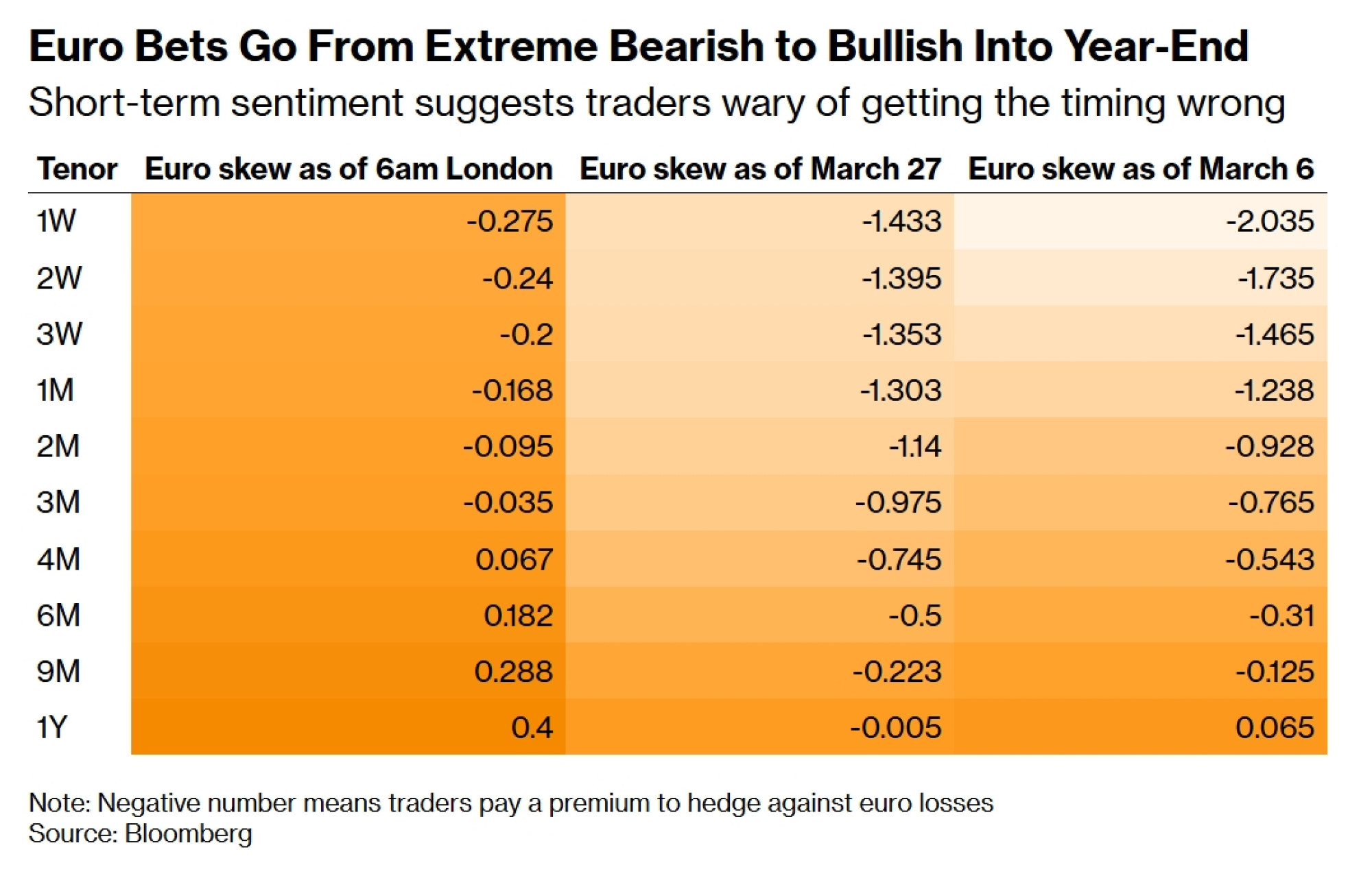 Troškovi zaštite tijekom sljedećih mjesec dana ostaju prigušeni, s impliciranom volatilnošću blizu šest posto, što je ispod ovogodišnjih vrhunaca iznad devet posto i ispod dugoročnog prosjeka. Istovremeno, trgovci su optimistični glede izgleda valute. To se može vidjeti u kretanju cijena jednogodišnjih risk reversala, koji mjere koliko je skupo kupiti u odnosu na prodati valutu na tržištu opcija.