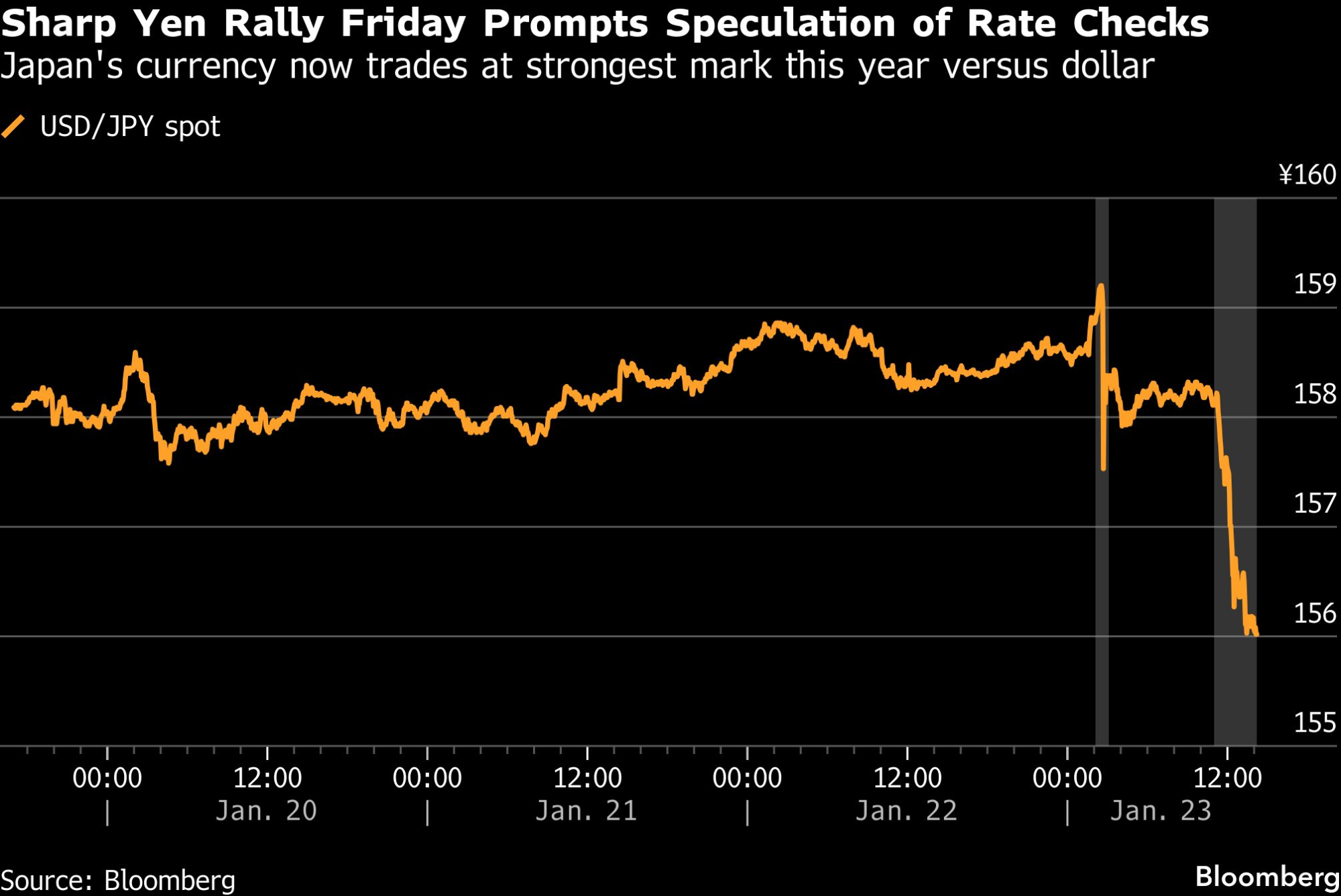 Spekulacije o intervenciji jačaju nakon što su trgovci tokom američke trgovačke sesije u petak izvjestili da je Njujorška banka Federalnih rezervi kontaktirala finansijske institucije kako bi se raspitala o kursu jena. Najviši japanski zvaničnik za valutu ranije tog dana odbio je da komentariše da li je i sa japanske strane sprovedena provjera kursa.