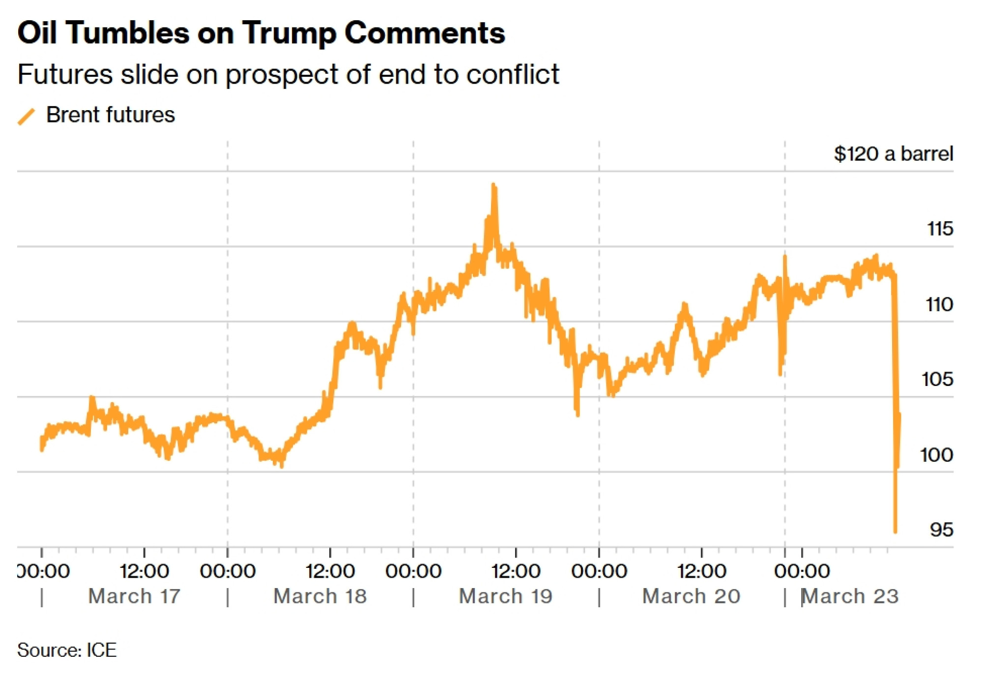 Terminski ugovori za naftu Brent potonuli su nakon što je američki predsjednik Donald Trump izjavio da je naredio američkim snagama odgodu svih napada na iransku energetsku infrastrukturu na razdoblje od pet dana, nakon održanih rasprava o okončanju rata s Iranom.