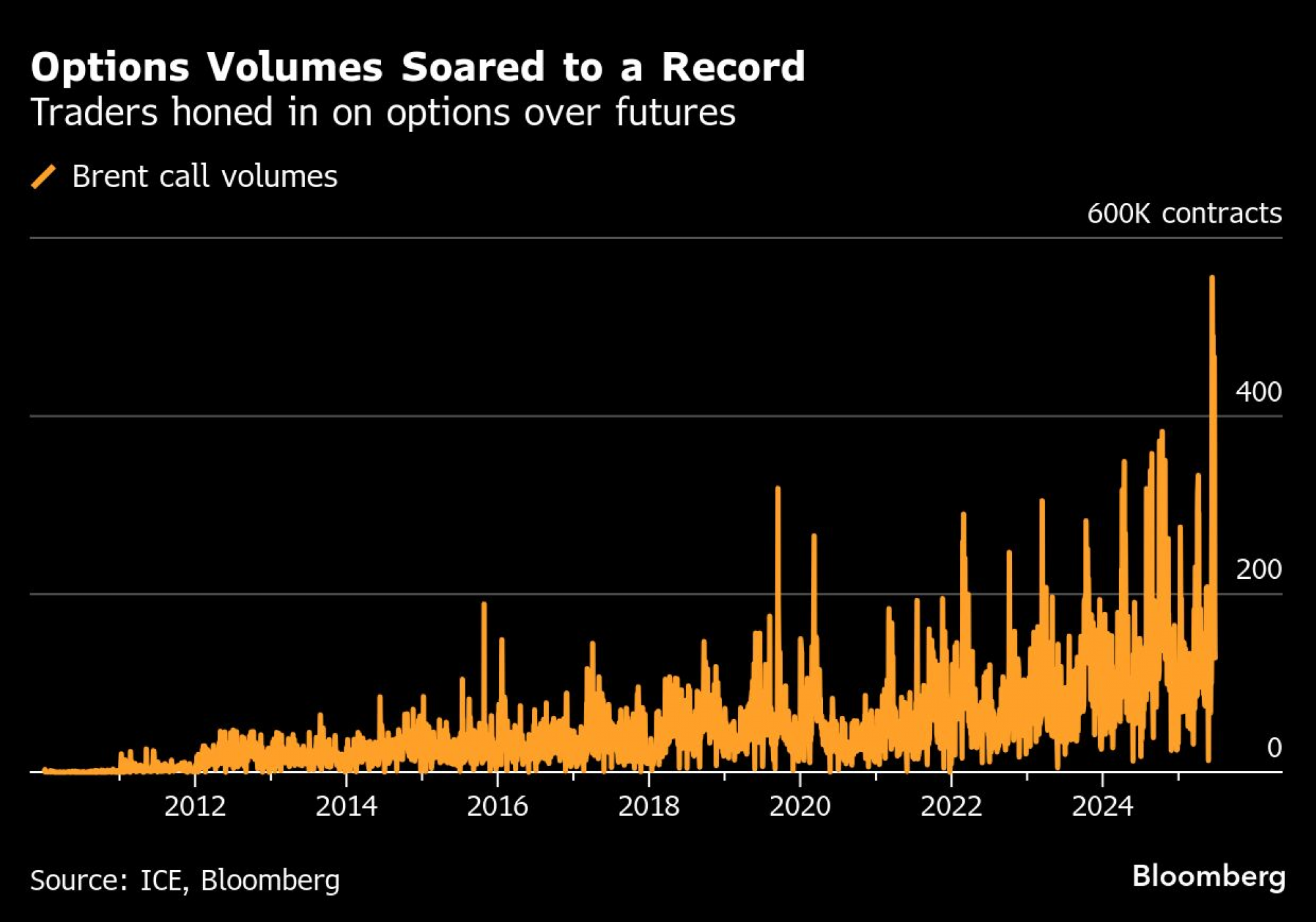 "U vremenima geopolitičkog rizika, trgovci prelaze na tržište opcija umjesto na tržište fjučersa", rekao je Nicky Ferguson, šef analitike u kompaniji Energy Aspects Ltd. "Tokom posljednjeg mjeseca nismo vidjeli veće promjene u fjučers pozicijama diskrecionih hedž fondova, ali je njihova izloženost opcijama s rastućim očekivanjima eksplodirala."