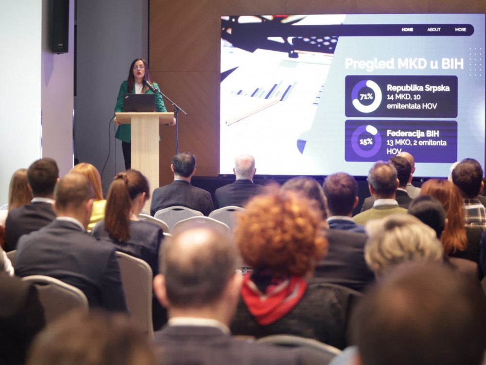 Tanja Šebez iz Advantis brokera je, govoreći o emisijama, performansama i trendovima, istakla da je 70 odsto MKD u Republici Srpskoj emitovalo HOV do sada, bilo da je riječ o obveznicama, komercijalnim zapisima ili akcijama, dok su u FBiH dva MKD emitovala obveznice.