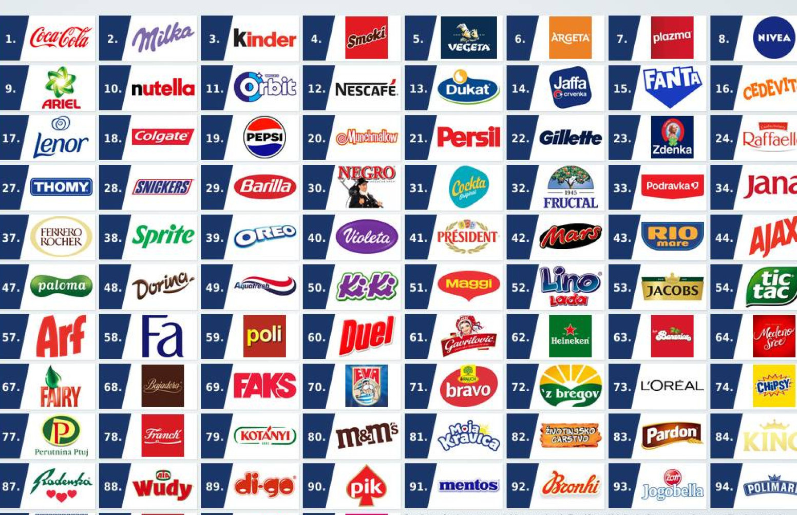 Vrh liste u BiH pokazuje izrazitu otvorenost tržišta. Među najjačima su i globalni giganti poput Milka i Kinder, kao i Coca-Cola.